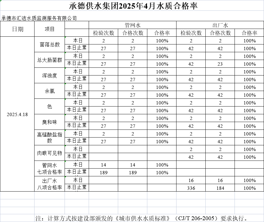 承德供水集團2025年4月18日水質(zhì)合格率