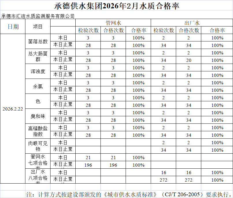 承德供水集團(tuán)2026年2月22日水質(zhì)合格率